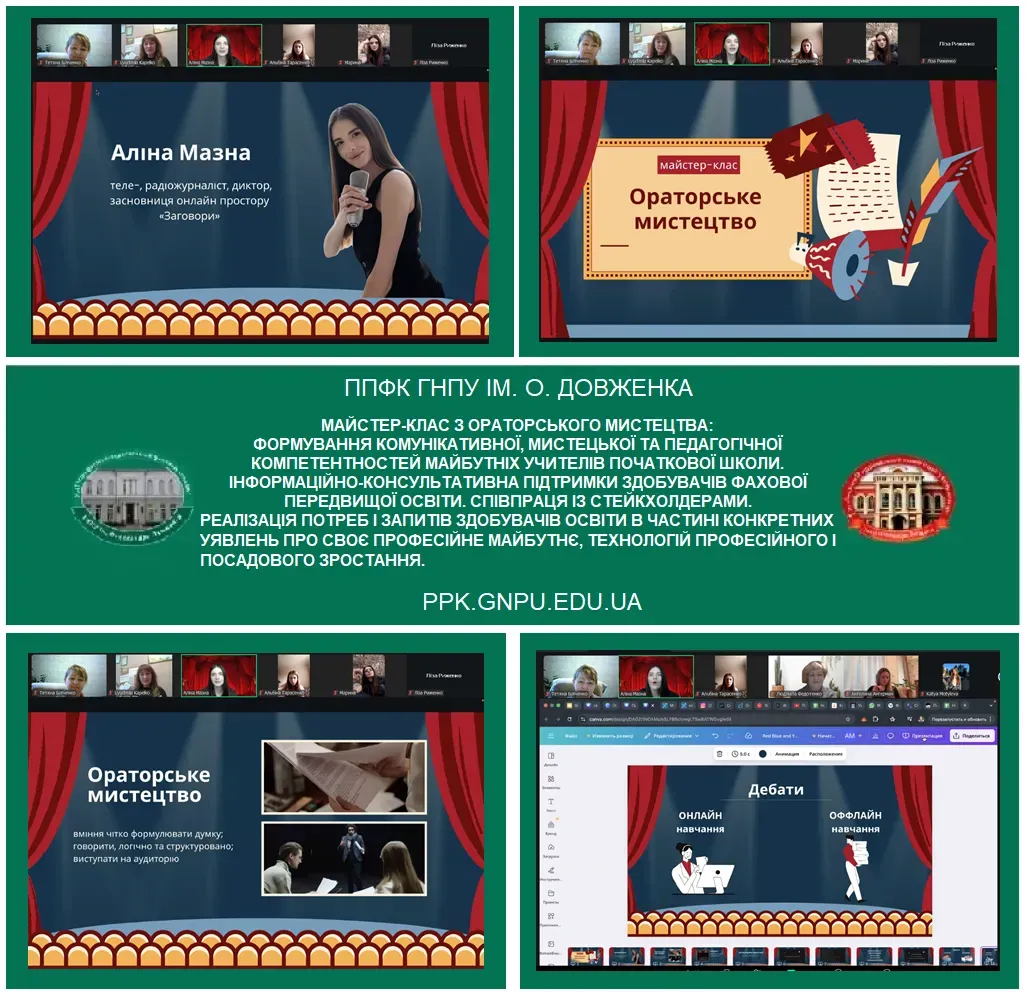 МАЙСТЕР-КЛАС З ОРАТОРСЬКОГО МИСТЕЦТВА: ФОРМУВАННЯ КОМУНІКАТИВНОЇ, МИСТЕЦЬКОЇ ТА ПЕДАГОГІЧНОЇ КОМПЕТЕНТНОСТЕЙ МАЙБУТНІХ УЧИТЕЛІВ ПОЧАТКОВОЇ ШКОЛИ. ІНФОРМАЦІЙНО-КОНСУЛЬТАТИВНА ПІДТРИМКИ ЗДОБУВАЧІВ ФАХОВОЇ ПЕРЕДВИЩОЇ ОСВІТИ. СПІВПРАЦЯ ІЗ СТЕЙКХОЛДЕРАМИ. РЕАЛІЗАЦІЯ ПОТРЕБ І ЗАПИТІВ ЗДОБУВАЧІВ ОСВІТИ В ЧАСТИНІ КОНКРЕТНИХ УЯВЛЕНЬ ПРО СВОЄ ПРОФЕСІЙНЕ МАЙБУТНЄ, ТЕХНОЛОГІЙ ПРОФЕСІЙНОГО І ПОСАДОВОГО ЗРОСТАННЯ